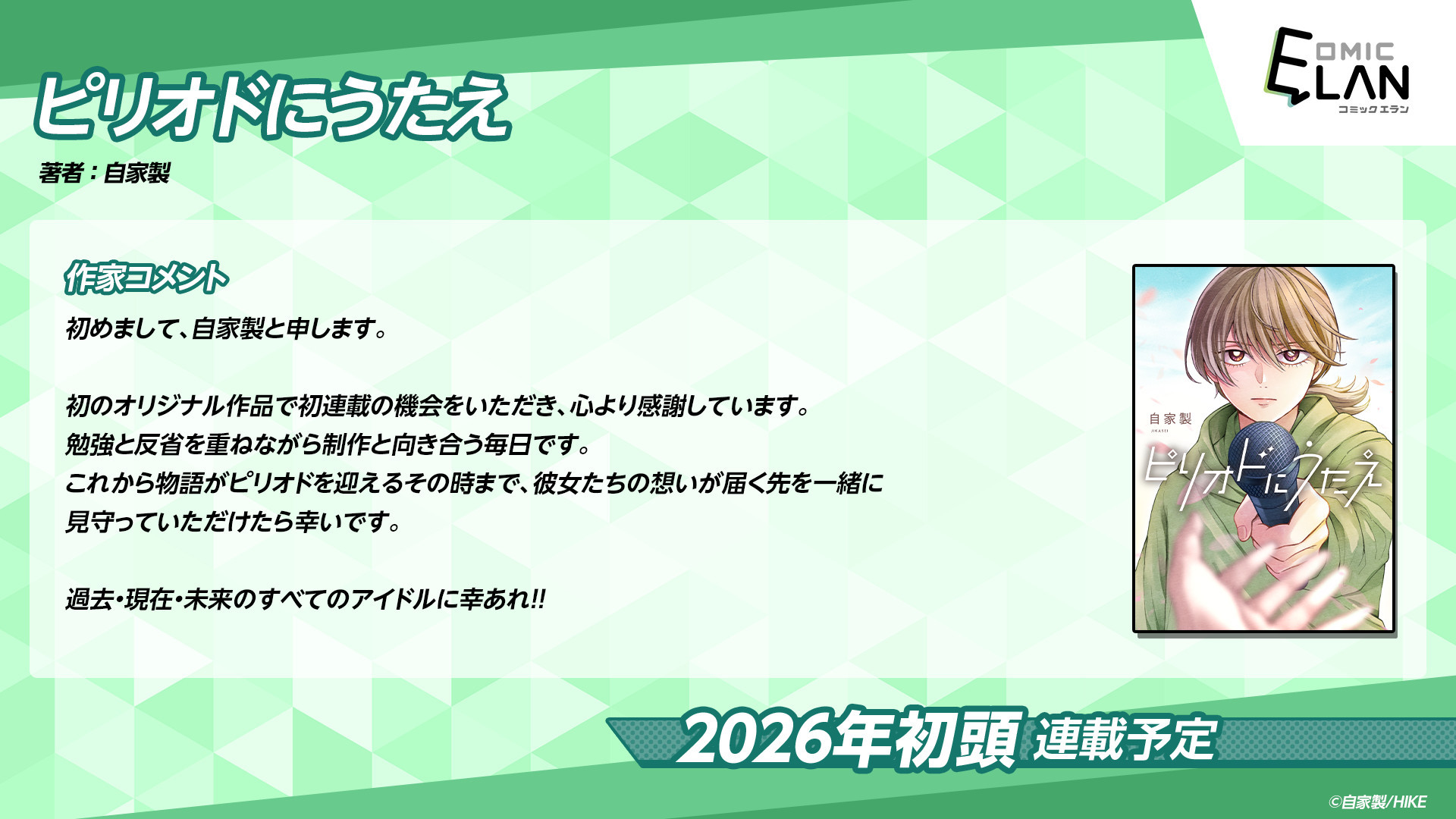 株式会社HIKE(本社:東京都新宿区、代表:三上 政高、以下「HIKE」)の電子漫画出版事業を担う「HIKE編集部」は、少年/青年向け作品を中心に扱うレーベル「COMIC ELAN」(コミックエラン)の第一弾となる4作品を連載開始予定です。本日からそれらの作品概要を4日連続で公開いたします。初回は、アイドルと音楽にまつわる漫画『ピリオドにうたえ』です。正式な配信開始日、配信プラットフォームは後日発表をお待ちください。