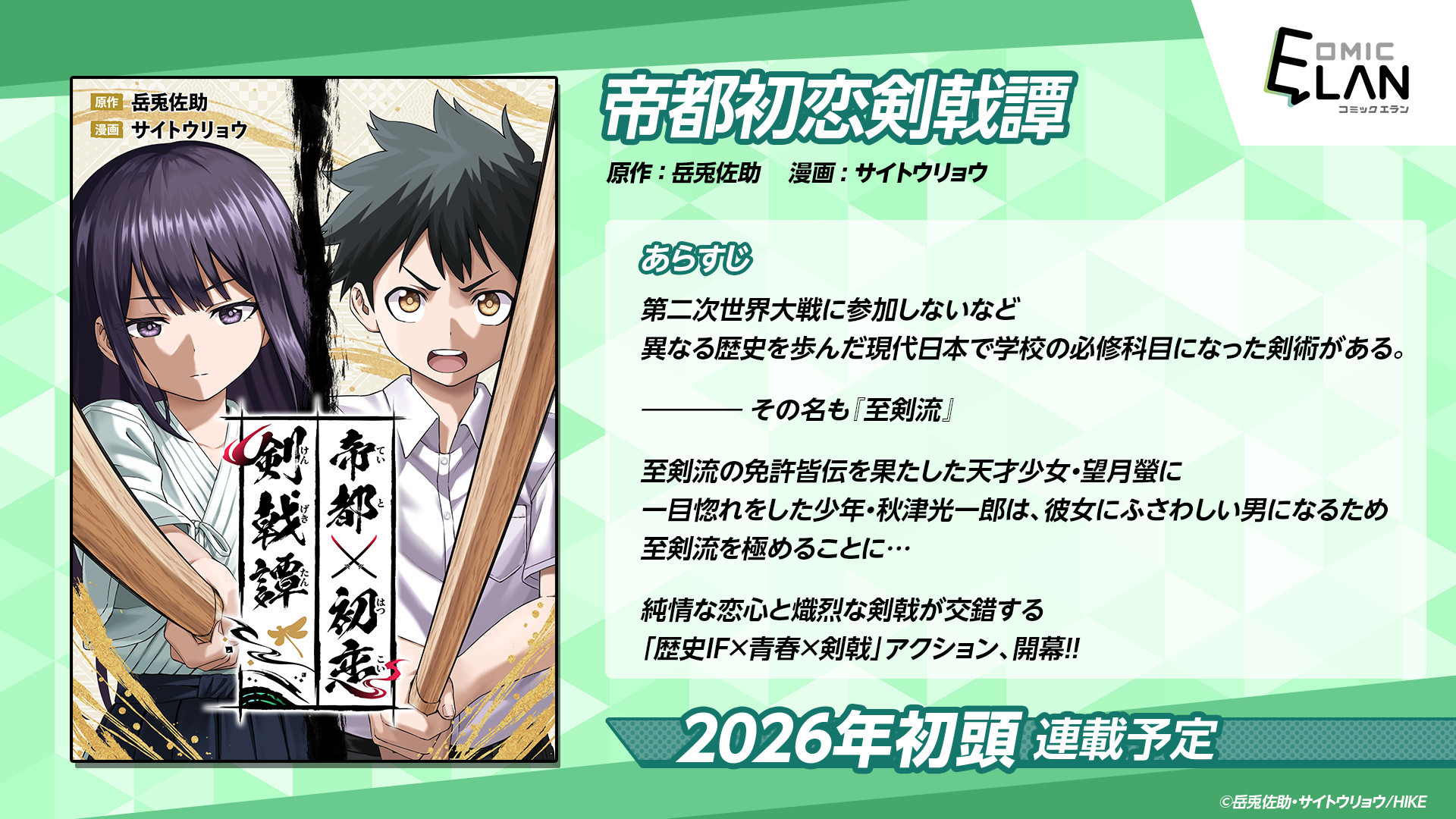 株式会社HIKE(本社:東京都新宿区、代表:三上 政高、以下「HIKE」)の電子漫画出版事業を担う「HIKE編集部」は、少年/青年向け作品を中心に扱うレーベル「COMIC ELAN」(コミックエラン)の第一弾として、『帝都初恋剣戟譚』(ていとはつこいけんげきたん)を連載開始予定です。本作品は「歴史IF×青春×剣戟」アクションで、日本最大級の小説投稿サイト「小説家になろう!」にて2023年9月より連載中の同名作品のコミカライズです。正式な配信開始日、配信プラットフォームは後日発表をお待ちください。