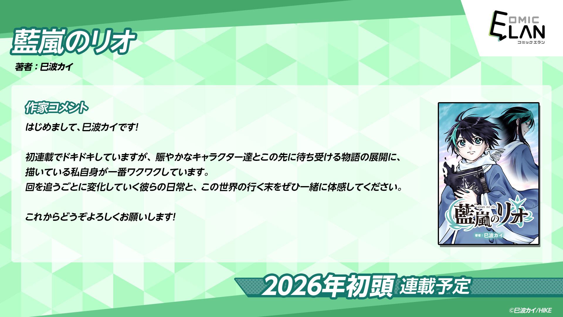株式会社HIKE(本社:東京都新宿区、代表:三上 政高、以下「HIKE」)の電子漫画出版事業を担う「HIKE編集部」は、少年/青年向け作品を中心に扱うレーベル「COMIC ELAN」(コミックエラン)の第一弾として、『藍嵐のリオ』(あいらんのりお)を連載開始予定です。本作品は大魔法使いの兄をもつ少年・リオが、ある日不思議な本に選ばれたことから始まるハイファンタジーです。正式な配信開始日、配信プラットフォームは後日発表をお待ちください。