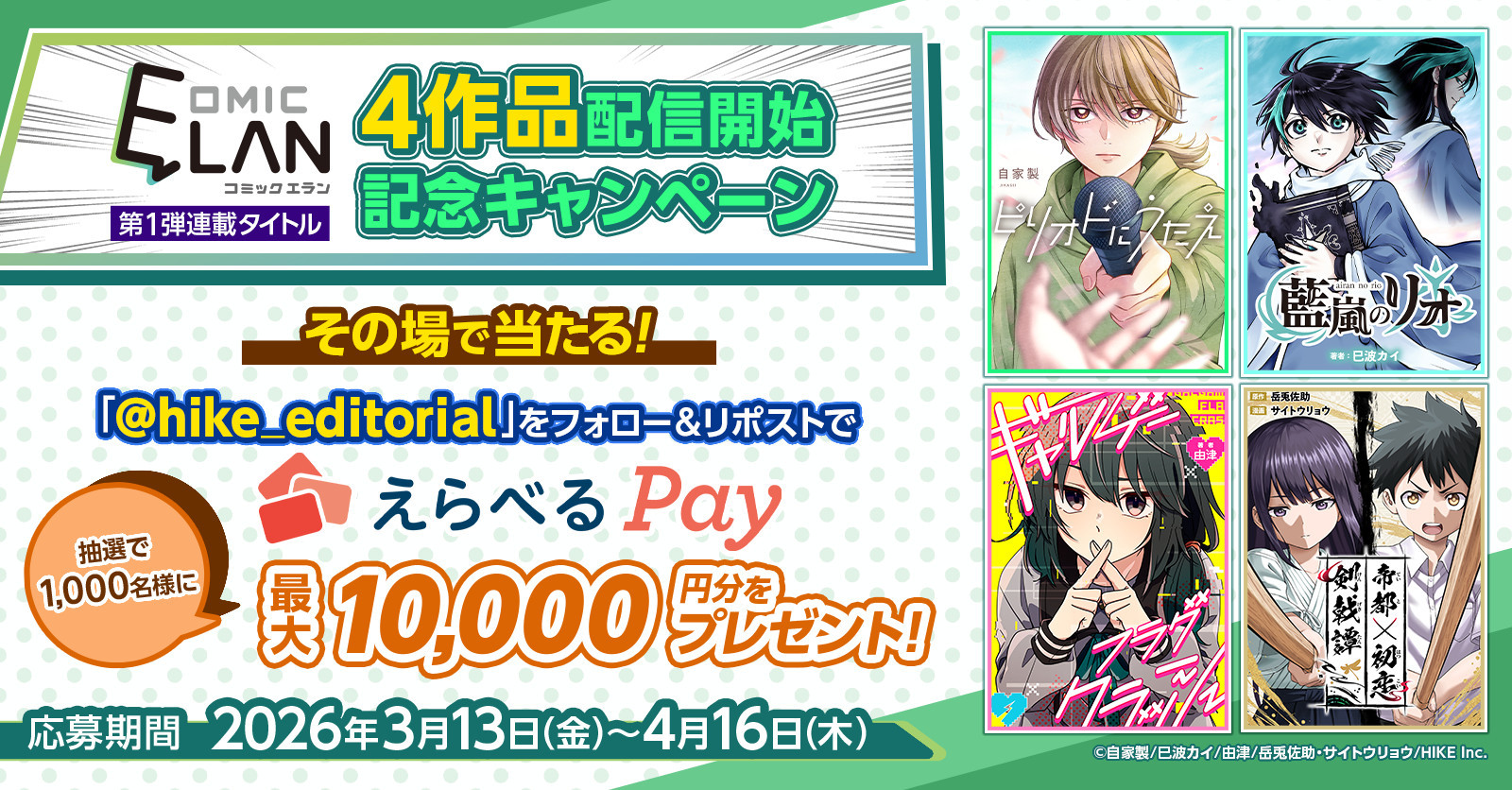 HIKE編集部(運営:株式会社HIKE)は、少年/青年向けマンガレーベル「COMIC ELAN」(コミックエラン)4作品の配信開始を記念し、本日3月13日(金)から4月16日(木)まで、抽選で1,000名様に「えらべるPay」最大10,000円分をプレゼントするキャンペーンを実施します。応募条件はHIKE編集部公式Xアカウントをフォローし、該当する投稿をリポスト。当選はその場で分かります。この機会にぜひご応募ください!